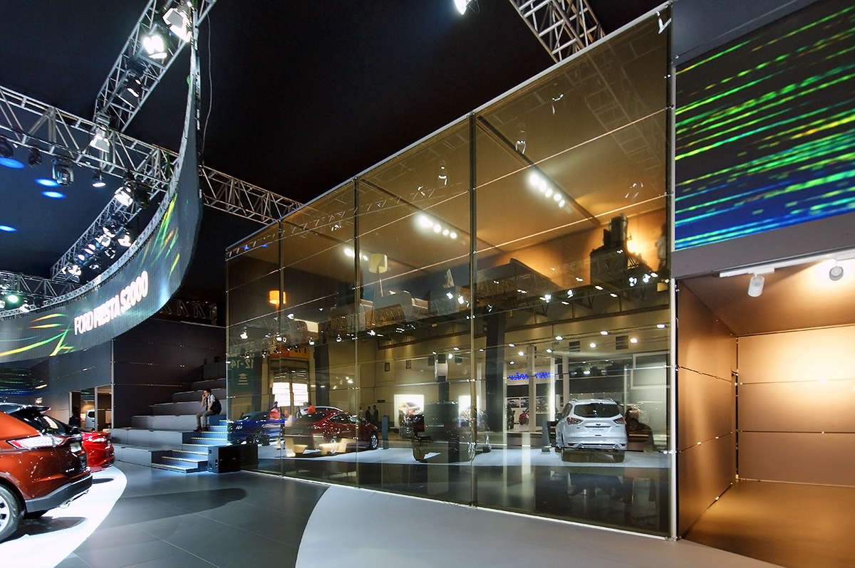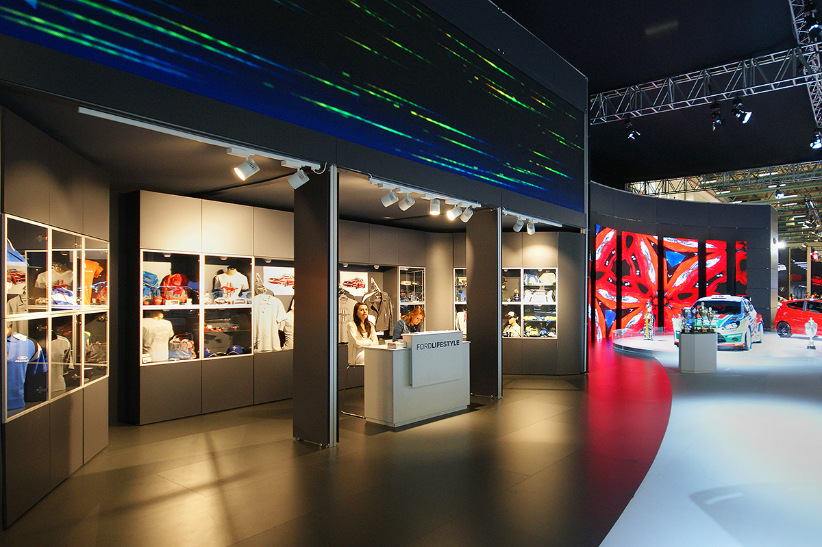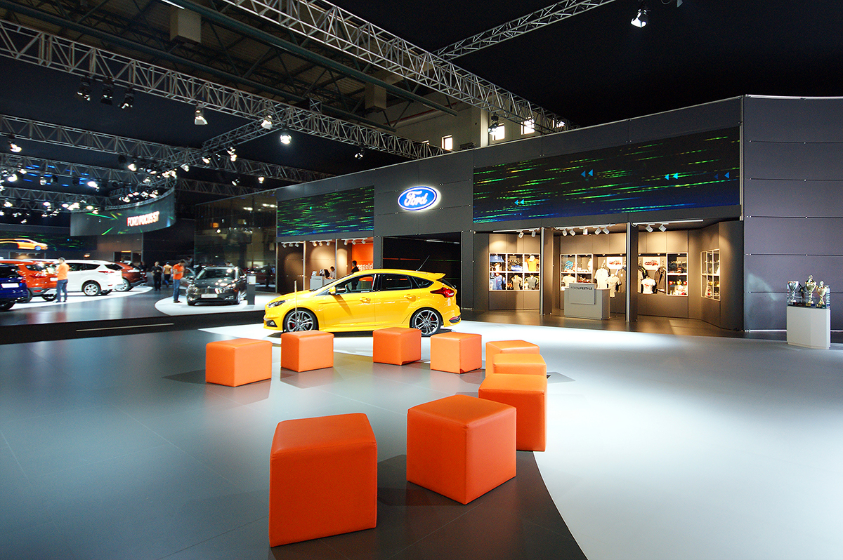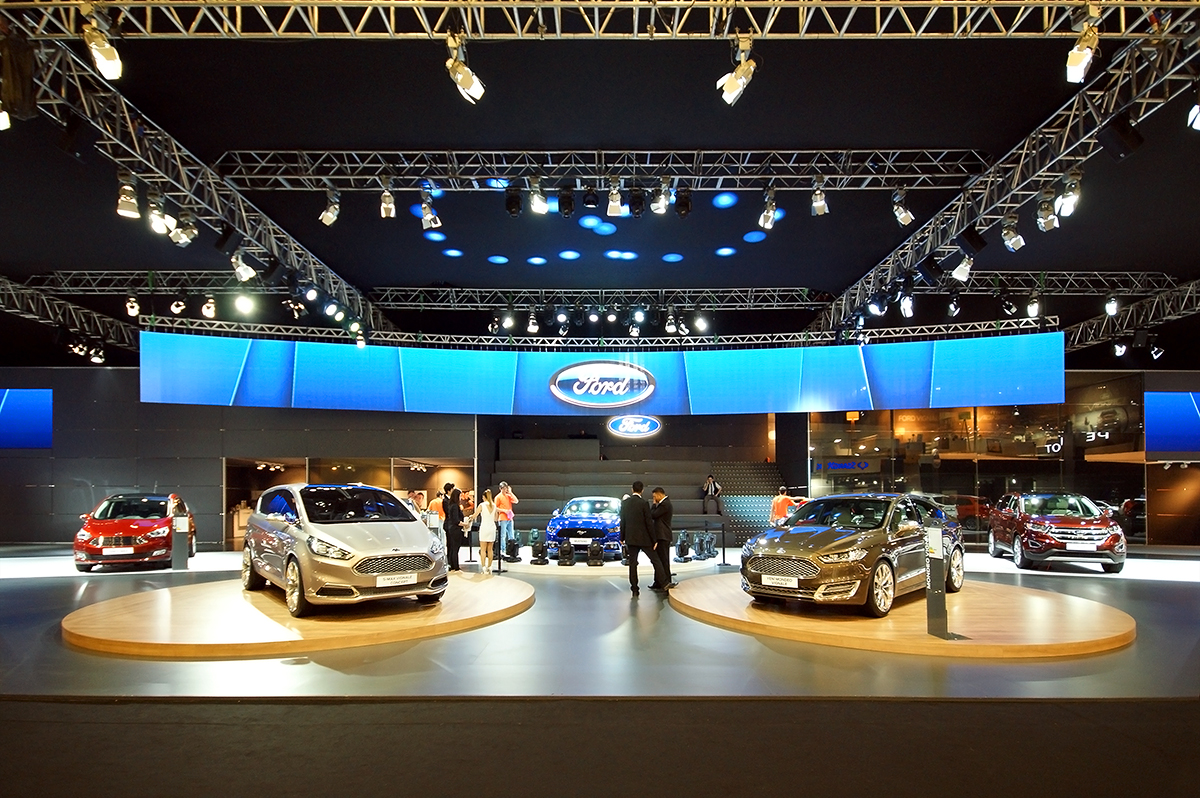 Ford Autoshow 2015 standı, markanın yenilikçi yaklaşımını ve premium algısını güçlü bir mekânsal kurgu ile ziyaretçilere aktarıyor. Ferah planlama, dairesel araç sergileme alanları ve dijital yüzeylerle desteklenen modern sahne dili; hem ürünleri ön plana çıkarıyor hem de ziyaretçilere konforlu ve akıcı bir deneyim sunuyor. Lounge alanları ve Vignale konseptiyle bütünleşen tasarım, Ford’un teknoloji ve konfor odaklı vizyonunu net bir şekilde yansıtıyor.