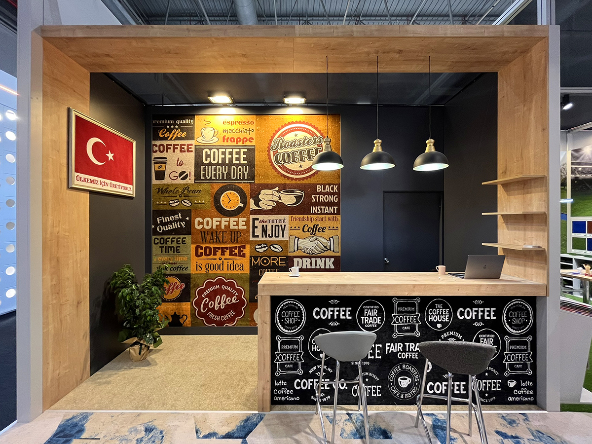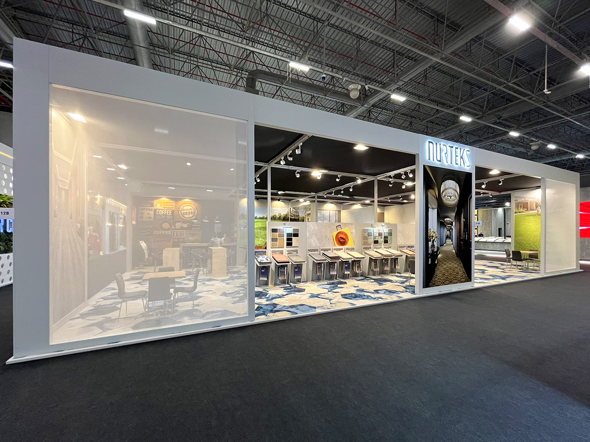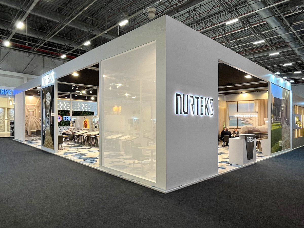 ICFE 2026 için tasarladığımız Nurteks standı, markanın suni çim ve halı endüstrisindeki uzmanlığını doğadan ilham alan modern bir mekan kurgusuyla sergiliyor. Yeşil dokuların ferahlatıcı etkisini, ahşabın sıcaklığı, açık ve antrasit detaylarla birleştiren tasarımımızda, ürünlerin dokusunu ön plana çıkaran dikey sergileme üniteleri kullandık. Ziyaretçilere konforlu bir görüşme alanı sunan geniş açık planlı yapısı ve kurumsal kimliği yansıtan estetik aydınlatma detaylarıyla, Nurteks’in sürdürülebilir ve yenilikçi yüzünü uluslararası bir platformda modern ve yalın çizgilerle temsil ettik.